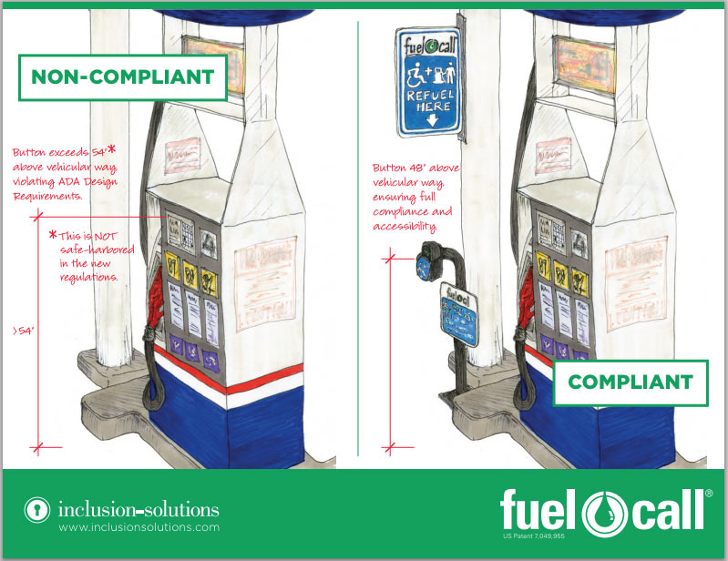 Not long ago, we posted about the change to the Americans with Disabilities Act (ADA) regarding the reach heights of operable parts at pumping stations that went into effect March 15. This change updated the 1990 rule that stated gas stations must provide refueling assistance without extra charges and let patrons know that assistance is available. The new change to the Act is meant to give those with disabilities the independence to pump their own gas, but it may still be difficult and dangerous for drivers with disabilities to refuel even with these lower, more accessible buttons. This is why some counties have adapted laws requiring stations to display placards at pumps carrying the International Symbol of Accessibility logo – the white wheelchair on a blue background – with a number to call to get an attendant; intercom systems could be used as well.