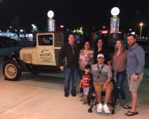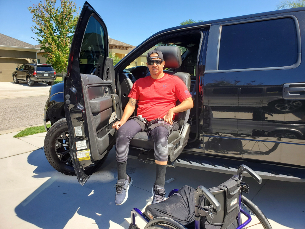 Rather than accept the recommendation and move ahead with a “less than desirable for a twenty-five year old” vehicle alternative, Joel challenged himself to continue his rehab, get stronger, and learn transferring techniques from other veterans and adaptive sport friends. One year later his efforts paid dividends as he took delivery of a blacked out 2014 Ford Raptor truck with an Adapt Solutions Link Seat. And two years later, to help transport his family, friends, inlaws, sports gear, etc., “from Florida to Denver to Chicago, to pretty much everywhere and back” he added a 2016 GMC VMI conversion van with a Ricon lift to his driveway. Both vehicles utilize push – rock hand controls.