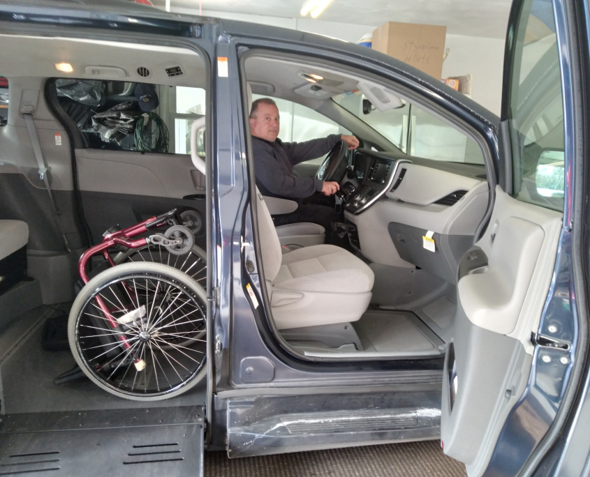 When a low mileage, 2019 Toyota Sienna with a Braunability conversion became available (a trade-in from a veteran), Steve was ready. He purchased the vehicle outright and worked with Mobility Works on installing right hand controls, a 6-way seat base, and a left side mounted push button transmission box. The vehicle’s low ramp angle was a major deciding factor, too, since he wants to maintain as much manual independence as possible.